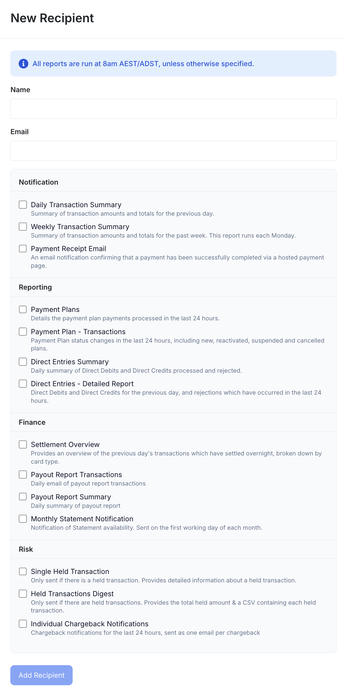 - Select each report that you would like the subscriber to receive. Please find the options below